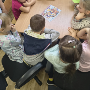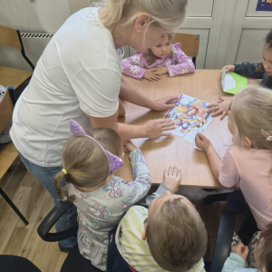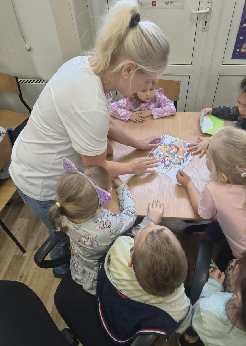 Po lekturze dzieci z zapałem odgadywały zagadki i układały puzzle związane z bohaterami ze Stumilowego Lasu. Na zakończenie zajęć każdy przedszkolak potrafił bez trudu wymienić przyjaciół Kubusia Puchatka — a to dowód, że Jeżyki słuchały dziś z ogromną uwagą!